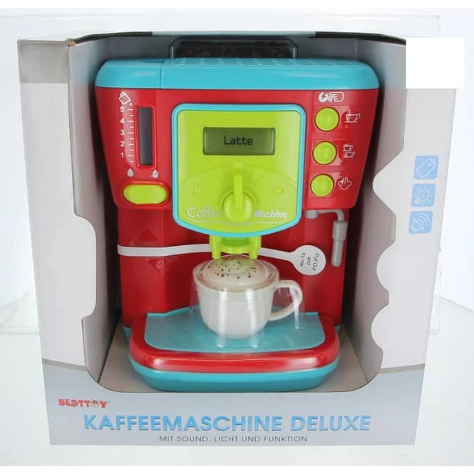 - Inhalt: Spielzeug-Kaffeemaschine, Tasse mit “Kaffee und Milchschaum” sowie 3 Plastikkartons mit Kaffeebohnen, Milch und Zucker
