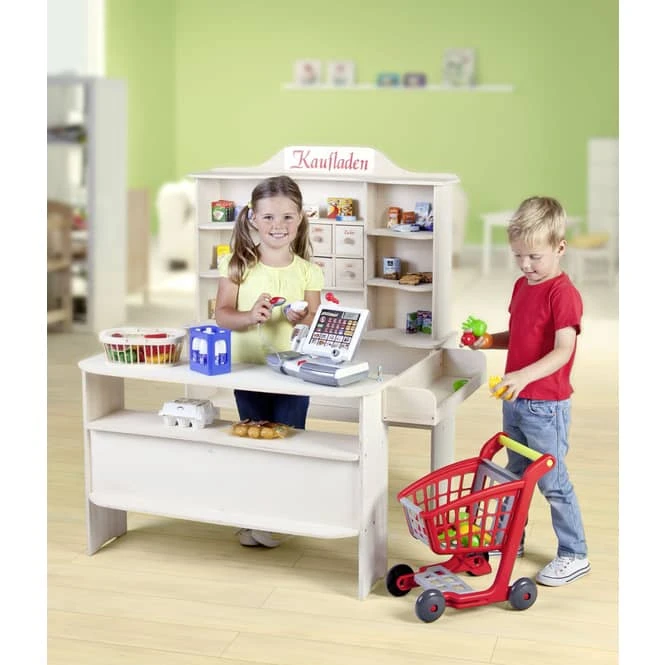 Einkaufen geht doch jedes Kinder gerne. Mit dem eigenen Kaufladen kann man die Einkaufswelt der Erwachsenen in das Kinderzimmer befördern. Der Einkaufswagen für Kinder bietet kleinen Einkäufern die Möglichkeit alle eingekauften Waren sicher im Kinder-Einkaufswagen unterzubringen. Neben dem Einkaufswagen sind auch noch einige Zubehörartikel in Form von Obst und Gemüse dabei, die im Kaufladen gekauft werden können.