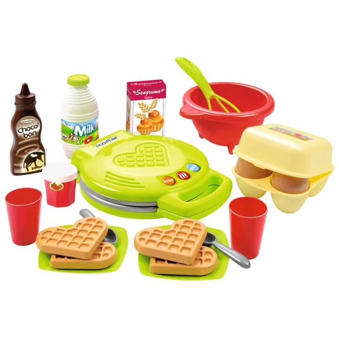 Im Set mit 22 Teilen ist ein Waffeleisen enthalten, welches natürlich nicht erhitzt und somit gefahrlos benutzt werden kann. Außerdem sind alle Zutaten enthalten, die man für einen richtig guten Waffelteig benötigt, wie z.B. Milch, Zucker und Eier. Auch Teller, Besteck und Becher sind im Lieferumfang enthalten. Somit kann der Backspaß in der Spielküche direkt beginnen!
