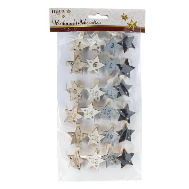 24 Adventskalenderklammern mit Stern – in braun/weiß/grau/schwarz – ca. 3,5×3,5cm