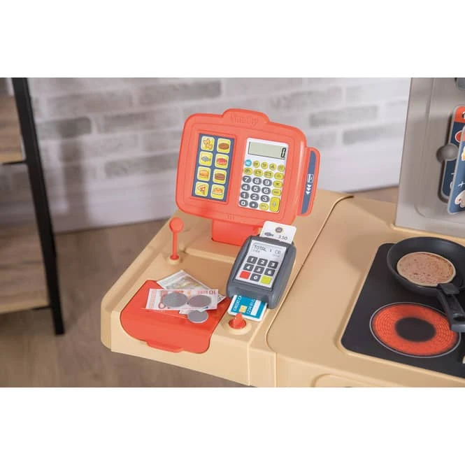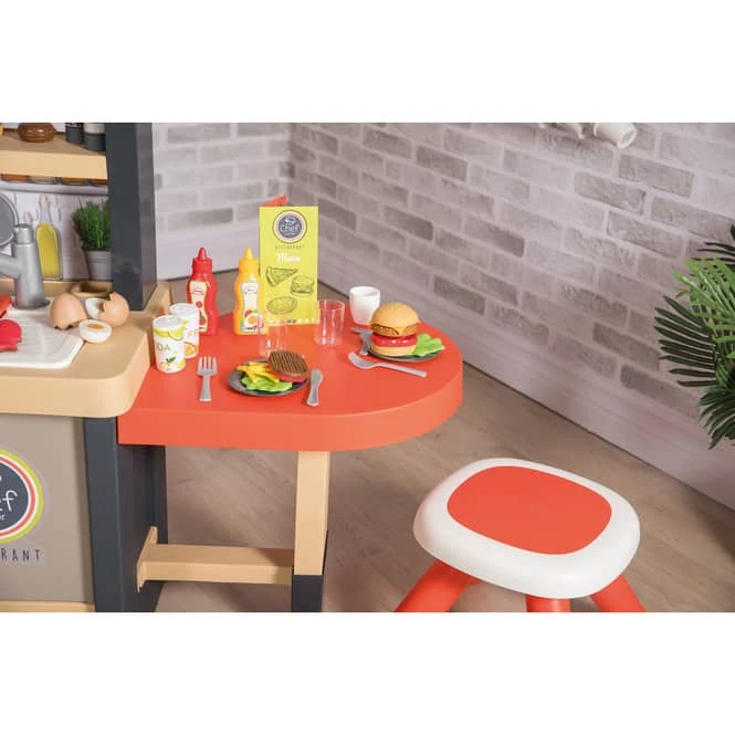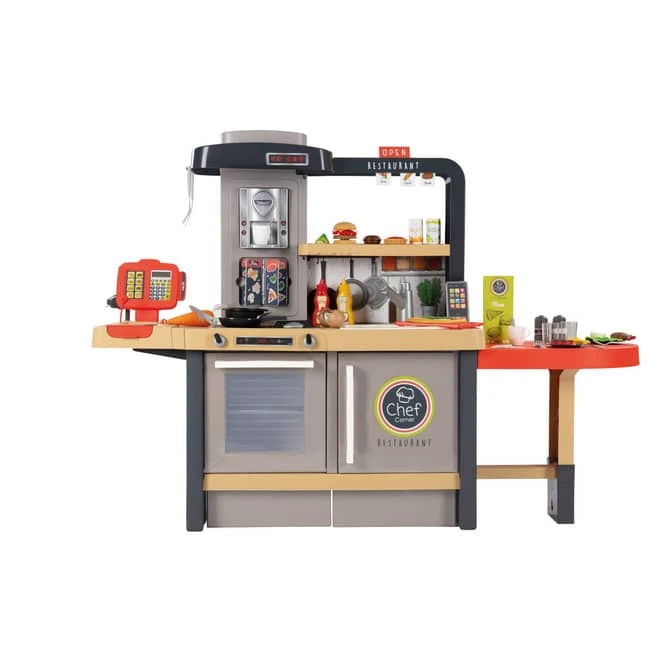 Das extra-große Chef Corner Restaurant vereint Küchenbereich, Essplatz, Kassenbereich mit Theke und Essensausgabe in einem Produkt und bietet so unendlich viele Spielmöglichkeiten. Dank des mitgelieferten Erhöhungssets wächst die Küche mit, für kleine Kinder ist die Höhe der Arbeitsfläche 50 cm, für größere Kinder 58 cm. 70 Zubehörteile und ein kleiner Stuhl runden die Premiumausstattung ab. An der Theke geben die Menütafeln Auskunft über die angebotenen Speisen. Ob Pizza oder Burger, die sich individuell belegen lassen, Pommes mit Ketchup und Mayonnaise, Fisch, Fleisch oder Vegetarisch, hier ist für jeden Geschmack etwas dabei. Die Leckereien können in der Spielküche zubereitet werden, die über einen Backofen, Herd mit elektronischem Kochfeld mit Sound, Kühlschrank, Spüle mit funktionsfähigem Wasserhahn, Espressomaschine und Kochbuch verfügt. Fisch und Fleisch haben zwei unterschiedliche Seiten: roh und gebraten; die magische Pasta wechselt ihre Farbe, wenn man sie in kaltes Wasser gibt, die Karotte kann geteilt und das gekochte Ei geöffnet und halbiert werden – ganz wie in echt. Dazu kommt die Pancake-Pfanne mit der sich der Pfannkuchen kinderleicht wenden lässt, Salz- und Pfefferstreuer mit Klick-Geräusch, Schneidebrettchen, Besteck, Geschirr, Küchenhelfer und Tabs für die Espressomaschine. Im Kassenbereich kann an der integrierten elektronischen Kasse mit Taschenrechner, Kreditkartenlesegerät und Spielgeldfach kassiert und bezahlt werden. Über das Mikrofon wird das fertige Essen ausgerufen. Serviert wird am Essplatz, wo die kleinen Gäste bequem auf dem Stuhl sitzen.