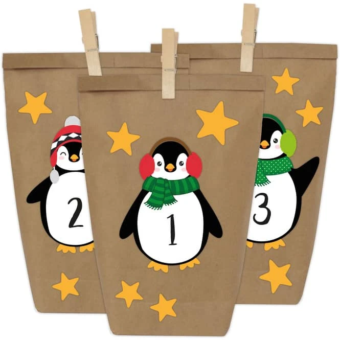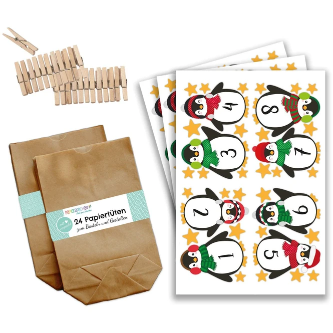 - Lieferumfang: 24 Kraftpapiertüten, 24 naturfarbene Holzklammern, Aufkleber
